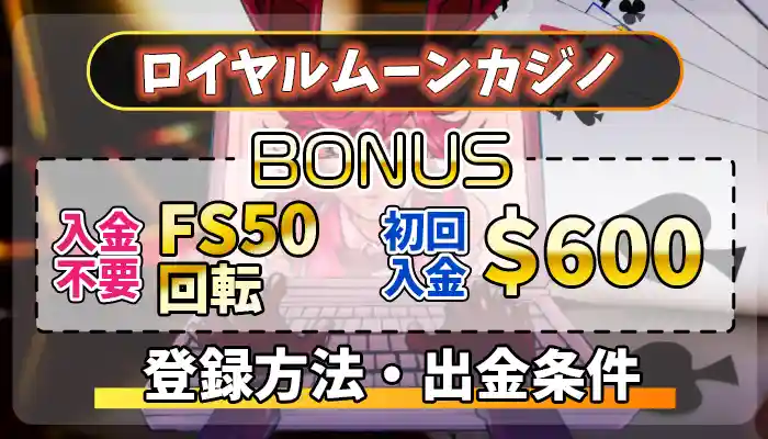 ロイヤルムーンカジノの入金不要ボーナス【フリースピン50回】の貰い方や登録方法、出金条件、入金ボーナス情報をまとめて解説します。今なら当サイトからの新規登録でフリースピン50回の入金不要ボーナスが貰えます!