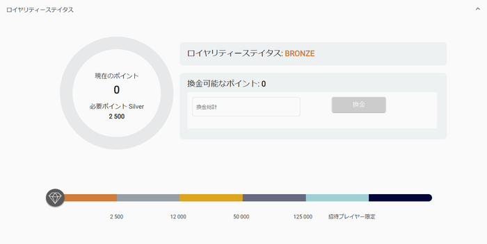 最大3万円の100%ボーナスのほかに、初回入金時にはロイヤリティポイントを2500ポイント分受け取ることもできます。