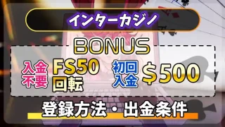 【FS50回転&500ドル】インターカジノの入金不要ボーナス・入金ボーナス・登録方法を徹底解説インターカジノで「入金不要ボーナス50回転FS」「最大500ドル入金ボーナス(キャッシュバック)」を貰う登録方法を詳しく紹介しています。ボーナスの出金方法や、バラエティ豊かなその他のボーナス情報も満載。当サイトからの登録限定なのでお見逃しなく!ボーナスを網羅してオンカジスタートダッシュを決めてください!...