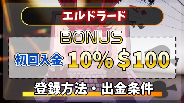 エルドラード 【10%100ドル】エルドラード(ELDORADO)の初回入金ボーナス・出金条件・登録方法を解説 2023年8月2日 admin オンカジギャンブラーの酒場|オンラインカジノ最強攻略サイト