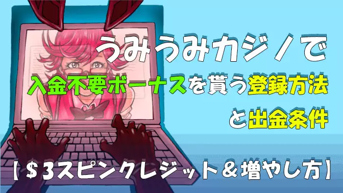 うみうみカジノ(Umiiumii)で貰える入金不要ボーナス【3ドル】スピンクレジット2種類の貰い方と登録方法、出金の条件を詳しく解説します。