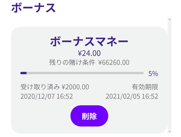 ワイルズカジノでは「マイプロフィール」から瞬時にボーナスの消化状況を把握することができます。