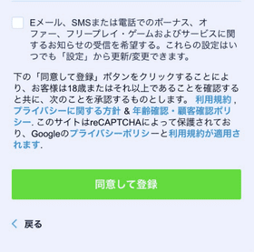 「Eメール、SMSまたは電話でのボーナス、オファー、フリープレイ・ゲームおよびサービスに関するお知らせの受信を希望する。