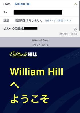 登録に利用したメールアドレスの受信ボックスをチェックしてみると、「さんへご連絡,〇〇(名前)」というタイトルでウィリアムヒルカジノからウェルカムメールが届いているはずです。