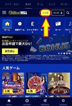 ウィリアムヒルカジノにログインできたら、画面上部に表示される「ご入金」というボタンをタップします。
