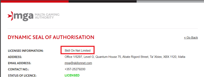 画像の赤枠で囲ってある「Skill On Net Limited」はウィニングキングスカジノの運営会社ですね。