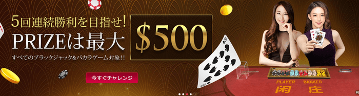 これはブラックジャックorバカラのライブゲームで5連勝すると、5回目のベット額の5倍の賞金を受け取れるというものです。獲得できる賞金の最高額は500ドルです。